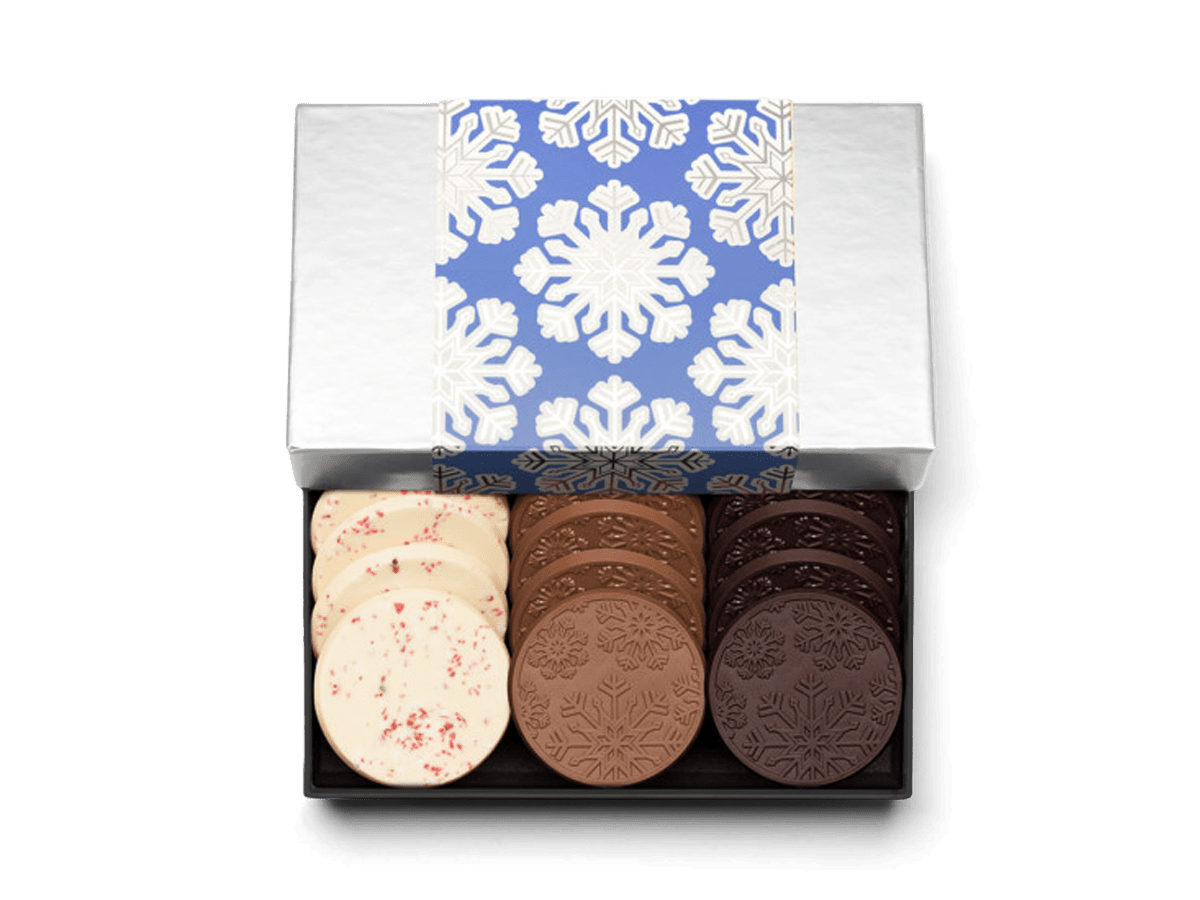 Indulge in winters wonder with this 12-piece gourmet cookie gift set. Each sugar cookie is individually wrapped and topped in rich premium chocolate. Includes four milk chocolate, four dark chocolate, and four peppermint bark cookies. The milk and dark varieties showcase an elegant 3-D snowflake design, and the collection comes beautifully packaged in a luxury silver gift box. A perfect treat for clients, colleagues, friends or family this holiday season.