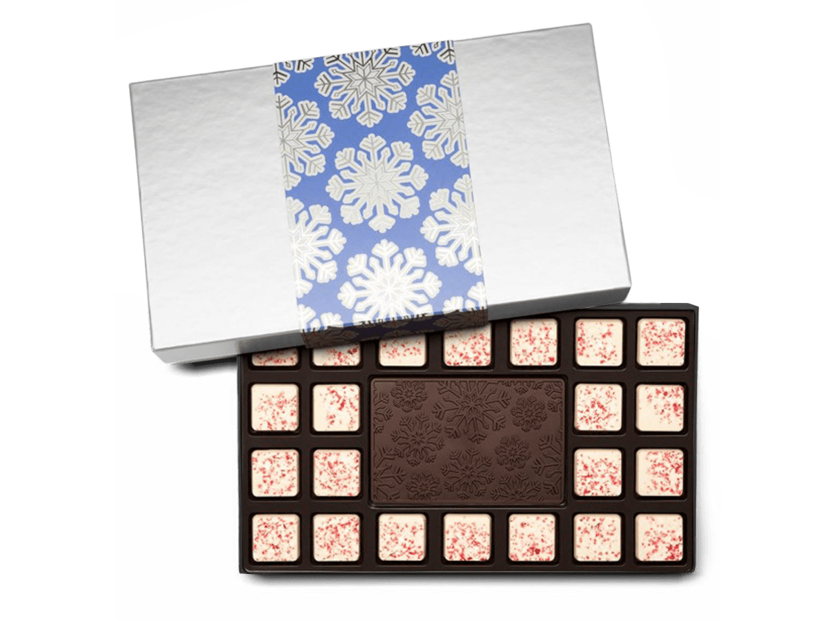 Celebrate the magic of the season with our 23-Piece Peppermint Bark Gift Set. A dazzling holiday treat as beautiful as it is delicious. Each piece features layers of creamy white chocolate and rich dark chocolate, topped with crisp peppermint candy pieces that sparkle like fresh-fallen snow.
