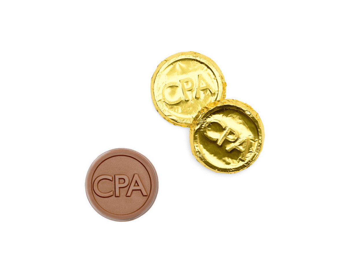 Reward financial excellence with this elegant 1.5" gold-foil coin featuring a CPA design, rich premium milk chocolate that celebrates achievement, dedication, and success. (.25 oz)