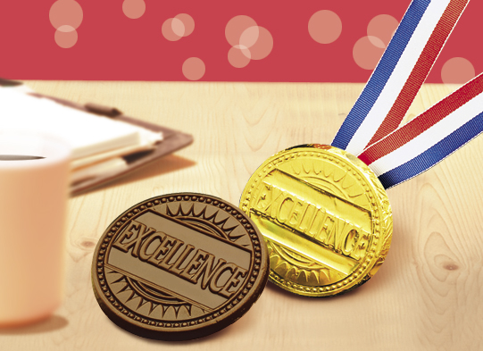 Reward Excellence with our 2.75" Belgian milk chocolate medallion. Each medallion is wrapped in gold foil and comes complete with a patriotic red, white and blue ribbon. Net wt. .75 oz.